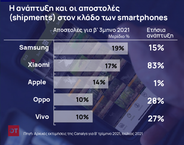 Στην κορυφή της προτίμησης συνέχισε να βρίσκεται η Samsung με μερίδιο 19%. Στη δεύτερη θέση πέρασε για πρώτη φορά στην ιστορία η Xiaomi με μερίδιο 17%, ενώ η Apple υποχώρησε από τη δεύτερη στην τρίτη θέση με 14%. Κινεζικές εταιρείες όπως οι Vivo και Oppo διατήρησαν ισχυρή την παρουσία τους στην αγορά συμπληρώνοντας την πρώτη πεντάδα. Αυτό προκύπτει από τα προκαταρκτικά στοιχεία της εταιρείας αναλύσεων του κλάδου τεχνολογίας Canalys.