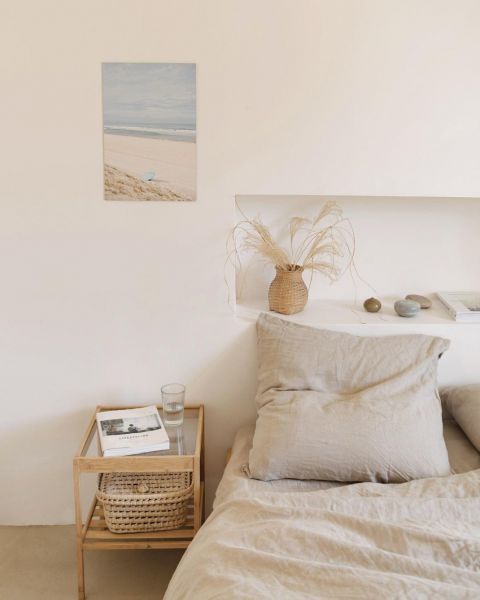 Πίσω από το κρεβάτι μια εσοχή στον τοίχο δημιουργεί ένα ενδιαφέρον οπτικό εφέ και σπάει τη μονοτονία μιας μεγάλης λευκής επιφάνειας. Τα λουλούδια στα βάζα δίνουν χρώμα και θετική ενέργεια σε κάθε γωνιά.