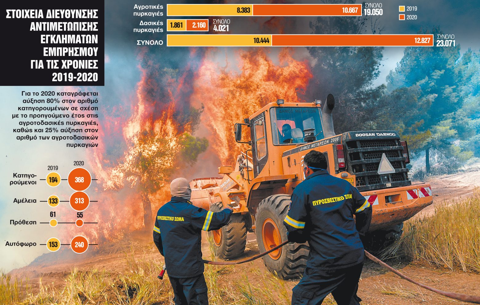 Τα επίσημα στοιχεία της ΔΑΕΕ αποδεικνύουν το μέγεθος του προβλήματος: για το 2020, σημειώθηκαν 12.827 αγροτοδασικές πυρκαγιές, αριθμός αυξημένος κατά 25% σε σχέση με το προηγούμενο έτος που οι αγροτοδασικές πυρκαγιές στο σύνολό τους ήταν 10.224. Μεταξύ των 368 κατηγορουμένων που εξέτασε η ΔΑΕΕ για τις πυρκαγιές του 2020, αριθμός επίσης αυξημένος σε σχέση με το 2019 κατά 80% (194 κατηγορούμενοι), πρόθεση αποδόθηκε μόνο στους 55, ενώ στην πλειοψηφία (στους 313) καταλογίστηκε αμέλεια. Τα ίδια νούμερα για το 2019 ήταν αρκετά διαφοροποιημένα: 61 οι περιπτώσεις που εντοπίστηκε πρόθεση και 133 οι υποθέσεις με αμέλεια, γεγονός που δείχνει ότι μέσα σε ένα έτος οι πυρκαγιές από αμέλεια υπερδιπλασιάστηκαν. Και αυτό εξηγεί και τη βαρύτητα που δίνεται φέτος από την πολιτική ηγεσία στο κομμάτι της πρόληψης, τόσο επικοινωνιακά, με τις καμπάνιες ευαισθητοποίησης και υπενθύμισης των πλέον αυτονόητων όπως το «δεν πετάμε αναμμένα τσιγάρα», όσο και επιχειρησιακά, με τα νέα σχέδια που τίθενται σε εφαρμογή, «για να προλάβουμε νέες τραγωδίες», όπως χαρακτηριστικά ανέφερε προ ημερών ο υπουργός Προστασίας του Πολίτη Μιχάλης Χρυσοχοΐδης ενόψει των σχεδίων για την τρέχουσα αντιπυρική περίοδο.