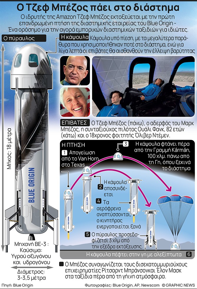 Σε ζωντανή μετάδοση πραγματοποιείται το απόγευμα της Τρίτης η πρώτη διαστημική πτήση αναψυχής της Blue Origin, με επιβάτες τον ιδρυτή της εταιρείας Τζεφ Μπέζος και την ιδιαίτερη παρέα του.