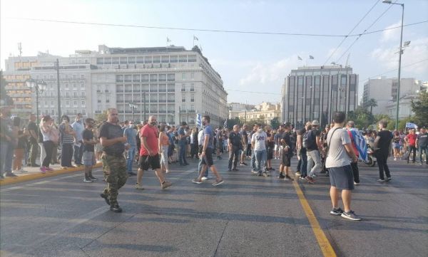 Κρατώντας ελληνικές σημαίες και με συνθήματα κατά των δημοσιογράφων και των ΜΜΕ, αρκετά από τα άτομα που συμμετέχουν παραπέμπουν σε ακροδεξιούς.