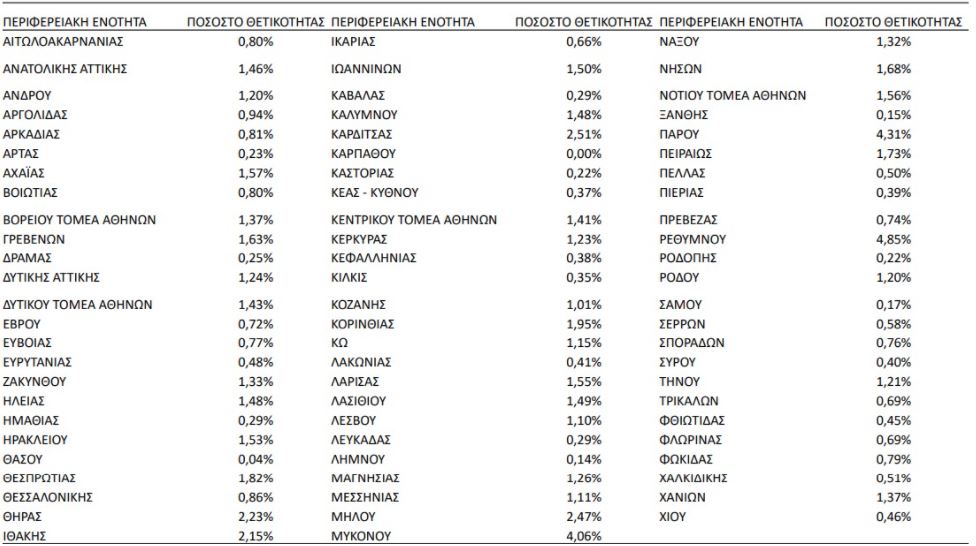 Το ποσοστό θετικότητας ανά περιφερειακή ενότητα