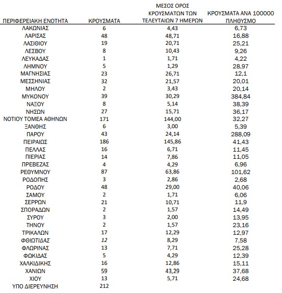 Έτσι η Πάρος είχε ποσοστό θετικότητας 4,31%, η Μύκονος 4,06%, το Ρέθυμνο 4,85%, η Σαντορίνη 2,23%, Ιθάκη 2,15%.