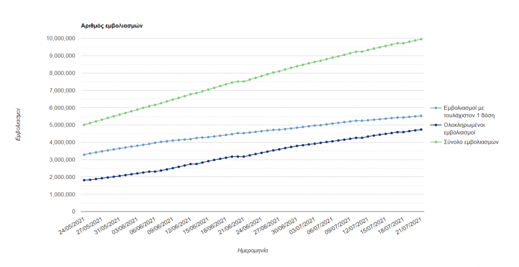 Μέχρι τη στιγμή που γράφονται αυτές οι γραμμές η εικόνα από τη «μάχη» του εμβολιασμού σύμφωνα με την επίσημη σελίδα emvolio.gov.gr έχει ως εξής: έχουν γίνει 4.734.403 ολοκληρωμένοι εμβολιασμοί, ενώ με μία δόση έχουν εμβολιαστεί 5.525.866 συμπολίτες μας.