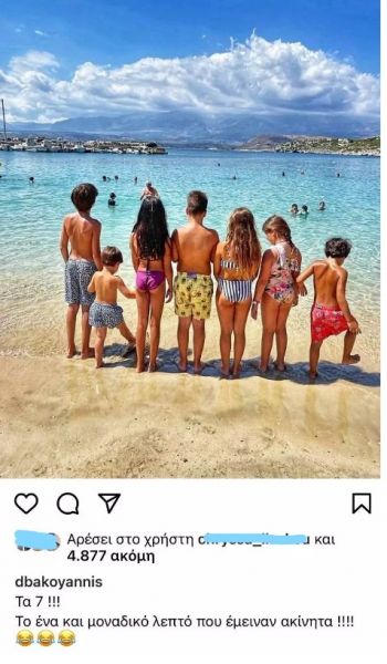 Το πρωί της Τετάρτης η Ντόρα Μπακογιάννη δημοσίευσε στον προσωπικό της λογαριασμό στο instagram μια φωτογραφία με όλα της τα εγγόνια από την παραλία την οποία συνόδευσε με το εξής σχόλιο: «”Τα 7 !!! Το ένα και μοναδικό λεπτό που έμειναν ακίνητα !!!!»