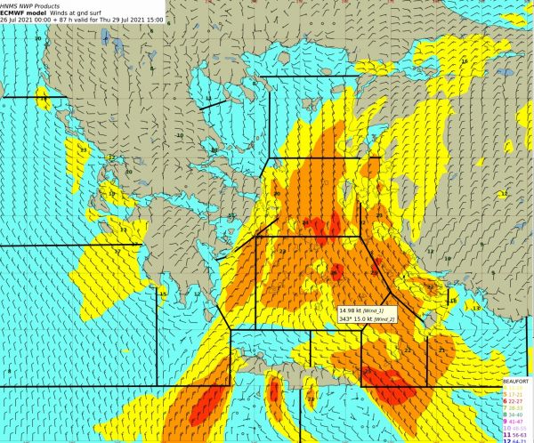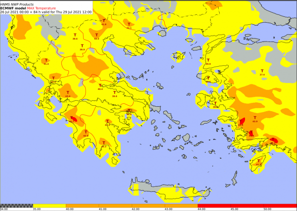 3. Την Πέμπτη (29-7-2021) υψηλές θερμοκρασίες θα επικρατήσουν σε όλη τη χώρα. Οι υψηλότερες τιμές προβλέπεται να σημειωθούν: α. Ηπειρωτική Ελλάδα: Στη δυτική Στερεά και τη Θεσσαλία (έως 41 με 42 βαθμούς Κελσίου) και στην κεντρική Μακεδονία και το εσωτερικό της Ηπείρου (έως 40 με 41 βαθμούς Κελσίου) β. Νησιωτική Ελλάδα: Στα νησιά του Ιονίου (έως 38 με 40 βαθμούς Κελσίου) και στα νησιά του ανατολικού Αιγαίου και τα Δωδεκάνησα (έως 37 με 38 βαθμούς Κελσίου).