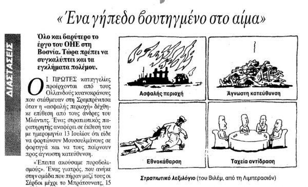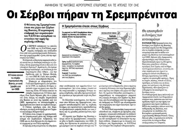 «Το νέο κύμα προσφύγων της Σρεμπρένιτσα συνεχίζει τη μαρτυρική περιπλάνησή του. Δεκατέσσερις χιλίαδες μουσουλμάνοι που οι Σέρβοι απομάκρυναν με λεωφορεία, διέσχισαν χθες την εμπόλεμη ζώνη και μπήκαν σε έδαφος που ελέγχεται από τη βοσνιακή κυβέρνηση.