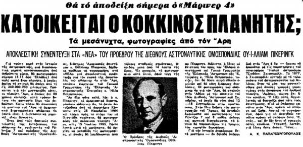 Γράφουν «ΤΑ ΝΕΑ» της 15ης Ιουλίου 1965: «Το αμερικανικό διαστημόπλοιο “Μαρίνερ – 4” επλησίασε τον Άρη μέχρις αποστάσεως 8.600 χιλιομέτρων και άρχισε να μεταδίδη φωτογραφίες της επιφανείας του, αντιφατικά, όμως, ραδιοφωνικά σήματα προκαλούν αβεβαιότητα αναφορικά με το αν η τηλεοπτική μετάδοση των φωτογραφιών γίνεται κατά τον προβλεπόμενο τρόπο στη Γη.