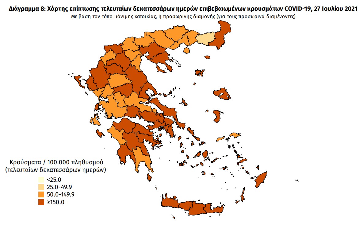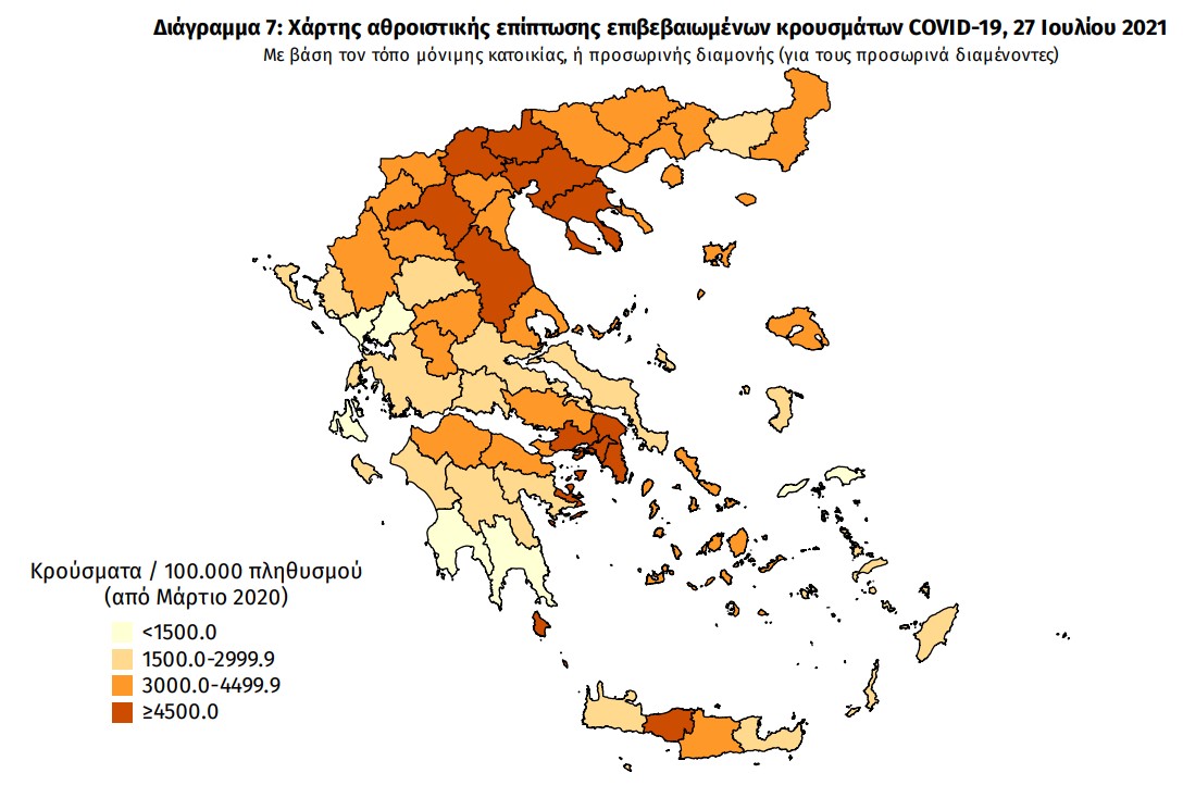 Με βάση τα επιβεβαιωμένα κρούσματα των τελευταίων 7 ημερών, 124 θεωρούνται σχετιζόμενα με ταξίδι από το εξωτερικό και 1.343 είναι σχετιζόμενα με ήδη γνωστό κρούσμα.