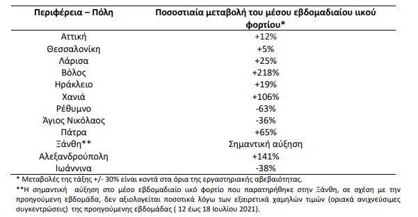 Οι καθαρά αυξητικές μεταβολές παρατηρήθηκαν στην Πάτρα (+65%), στα Χανιά (+106%), στην Αλεξανδρούπολη (+141%) και στο Βόλο (+218%), ενώ οριακές ήταν οι αυξήσεις στην Περιφέρεια Αττικής (+12%), στο Ηράκλειο (+19%) και στη Λάρισα (+25%).