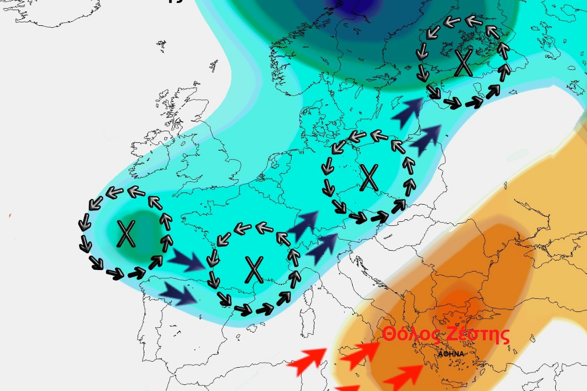 Ο Σάκης Αρναούτογλου γράφει στο Facebook: «Ένα ασυνήθιστο «Ατμοσφαιρικό Μποτιλιάρισμα» ή αλλιώς «κόλλημα» του καιρού (ένα αέρινο τείχος πάνω απο την την Ανατολική Μεσόγειο και τα Βαλκάνια) συνεχίζουν να δίνουν και τα τελευταία προγνωστικά στοιχεία εμποδίζοντας τα βαρομετρικά χαμηλά και μαζί δροσερότερες αέριες μάζες από τον Ατλαντικό, όχι μόνο να κινηθούν και να φτάσουν στην περιοχή μας, αλλά να συμβάλουν με την ανατολική-βορειοανατολική κίνησή τους πάνω από την Ευρώπη στην δημιουργία υψηλών πιέσεων ή πιο απλά ενός “Θόλου Ζέστης” πάνω απο την περιοχή μας.