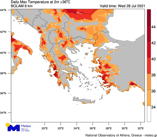 Σύμφωνα με τα προγνωστικά στοιχεία του Εθνικού Αστεροσκοπείου Αθηνών / meteo.gr, μικρή άνοδο αναμένεται να σημειώσει η θερμοκρασία σήμερα Τετάρτη 28/7. Έτσι οι μέγιστες θερμοκρασίες σε πολλές περιοχές θα ξεπεράσουν τους 38 βαθμούς, ενώ οι απολύτως μέγιστες θα φτάσουν τοπικά στα ηπειρωτικά στους 41-42 βαθμούς και στο Ανατολικό Αιγαίο τους 39-40 βαθμούς Κελσίου. Χαμηλότερα θα διατηρηθούν οι θερμοκρασίες στις Κυκλάδες και στη Βόρεια Κρήτη λόγω της επικράτησης βορείων ανέμων με εντάσεις 5-6 μποφόρ.