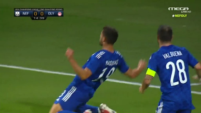 Ο κεντρικός αμυντικός των ερυθρολεύκων, έκλεψε την μπάλα κοντά στην περιοχή της Νέφτσι, έκανε κούρσα αλά… εξτρέμ και αφού δεν μπόρεσε να τελειώσει ο ίδιος τη φάση, έδωσε την μπάλα στον Βαλμπουενά ο οποίος με τη σειρά του έδωσε πάσα πάρε-βάλε στον Μασούρα που άνοιξε το σκορ στο 15ο λεπτό.