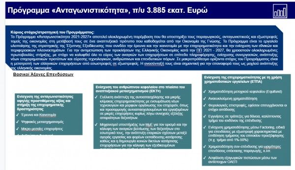 οι δράσεις για την ενίσχυση της ανταγωνιστικότητας ύψους 3.885 εκατ. ευρώ με μακροπρόθεσμο στόχο την μετατροπή των ελληνικών επιχειρήσεων από εσωστρεφείς σε εξωστρεφείς. Αφορά μεταξύ άλλων την ενίσχυση της ανταγωνιστικότητας υψηλής προστιθέμενης αξίας και τη στήριξη της επιχειρηματικής δραστηριότητας (Έρευνα και Kαινοτομία, Mικρο-μεσαίες επιχειρήσεις, φορολογικές επιστροφές, εγγυήσεις σε τράπεζες για δάνεια, χρηματοδότηση συν-επένδυσης για ωριμότερες επενδύσεις επέκτασης παραγωγής, κ.λπ.)