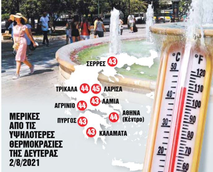 Σκηνές από το μέλλον ενός πλανήτη παραδομένου στην κλιματική αλλαγή, θα βιώσουν οι κάτοικοι της χώρας αυτές τις ημέρες. Ενα ακραίο και επικίνδυνο φαινόμενο παρατεταμένου καύσωνα, που ξυπνά μνήμες του 1987, εξελίσσεται στην Ελλάδα. Σύμφωνα με τις προγνώσεις, ο υδράργυρος θα σκαρφαλώσει κατά τόπους ακόμη και στους 45°C, οι ελάχιστες τιμές δεν θα πέφτουν κάτω από τους 27°C – ακόμη και σε μη αστικές περιοχές – ενώ η κορύφωση της ζέστης προβλέπεται να ξεκινήσει την Κυριακή και να διαρκέσει τουλάχιστον τέσσερις μέρες. Πρόκειται για ένα φαινόμενο από αυτά που οι επιστήμονες ανέμεναν ότι θα εκδηλώνονταν στη Νότια Ευρώπη μερικές δεκαετίες αργότερα λόγω της κλιματικής αλλαγής.