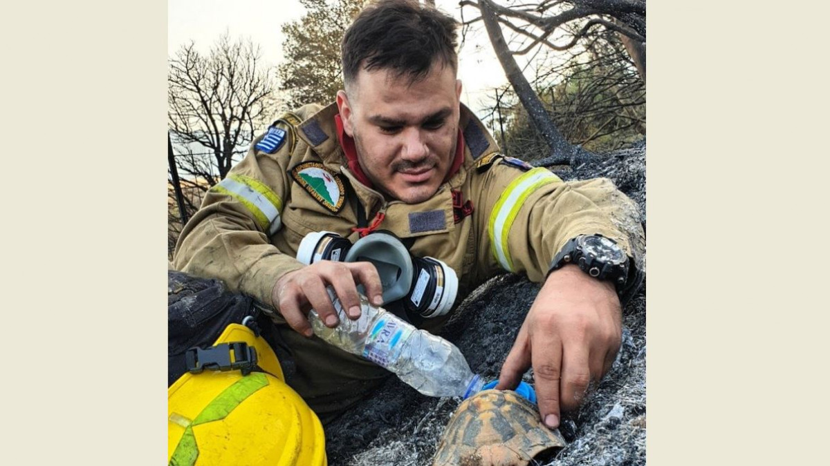 Μας χάρισε μια από τις πιο συγκλονιστικές φωτογραφίες. Ο πυροσβέστης δίνει νερό στη χελώνα μέσα σε ένα τοπίο καμένο. Η ζωή και ανθρωπιά, η φύση, νικάει το κακό.