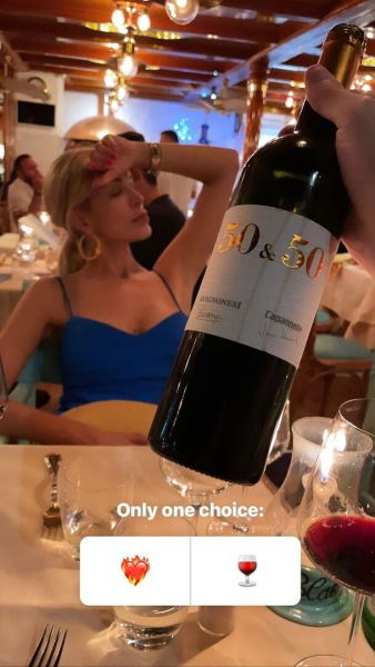 Ο επιχειρηματίας όμως δεν το άφησε να πέσει κάτω. Σε μία από τις εξόδους τους, το ζευγάρι κάθισε για φαγητό και τότε κράτησε στα χέρια του ένα μπουκάλι κρασί, με την Κατερίνα Καινούριου να φαίνεται σε μία κατάσταση δυσφορίας στο φόντο. Τη φωτογραφία συνόδευσε με ένα δίλημμα που ρωτούσε το κοινό τι θα διάλεγε αν μπορούσε να κάνει μόνο μία επιλογή: έρωτα ή ποτό.