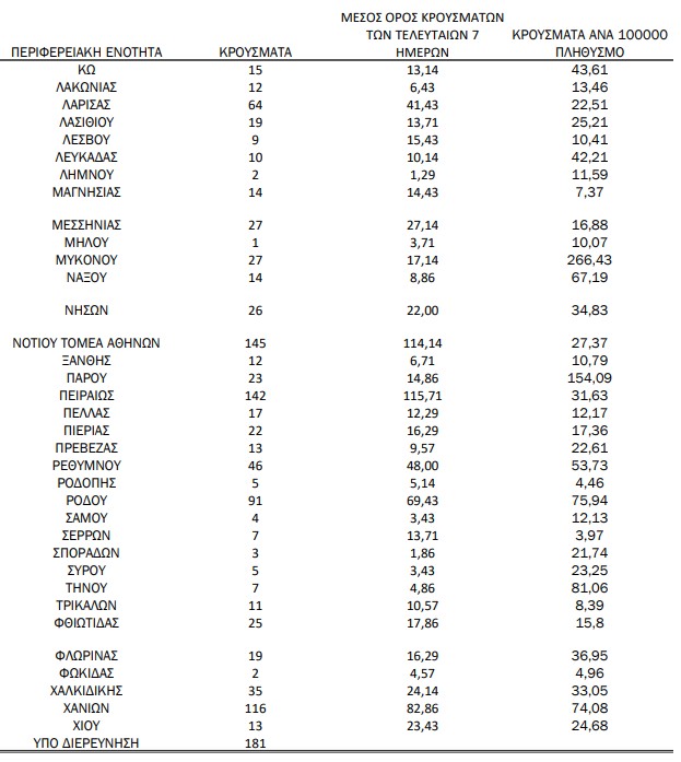 Τέλος, Δυτική Αττική και νησιά του Αργοσαρωνικού καταγράφουν 34 και 26 κρούσματα αντίστοιχα.