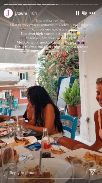 Πιο συγκεκριμένα η γνωστή influencer βρέθηκε για διακοπές στους Παξούς και εξέφρασε ανοιχτά την έκπληξη και τον προβληματισμό της, επειδή μέσα στο καταμεσήμερο τα εστιατόρια του νησιού ήταν κλειστά.