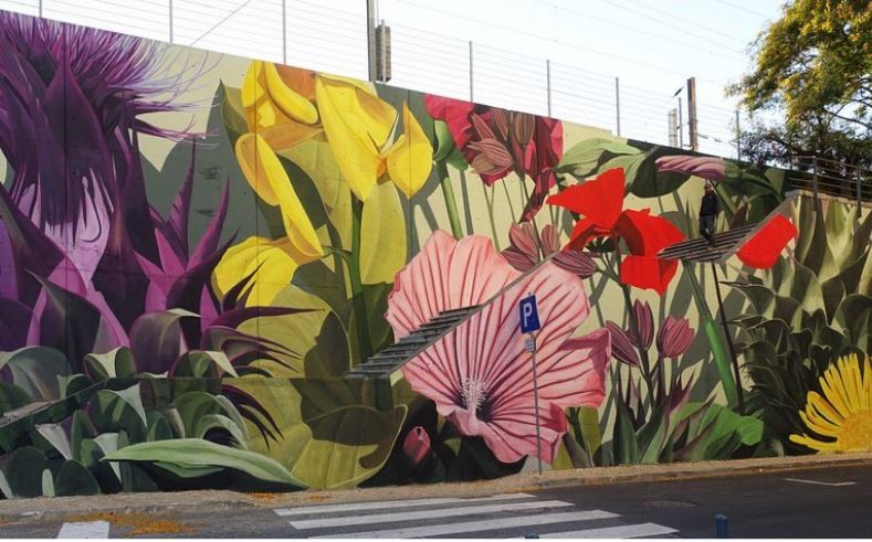 Μια φαινομενικά ατέλειωτη ποικιλία λουλουδιών αναφύεται στις τοιχογραφίες του Thiago Mazza καθώς αυτές έρπουν κατά μήκος πεζοδρομίων και τυλίγουν ολόκληρα κτίρια.