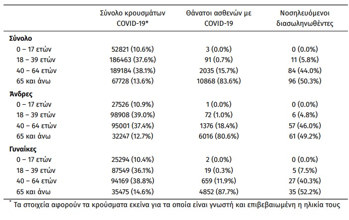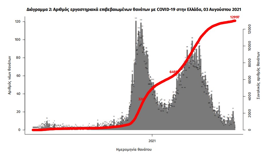 Οι νέοι θάνατοι ασθενών με COVID-19 είναι 14, ενώ από την έναρξη της επιδημίας έχουν καταγραφεί συνολικά 12.997 θάνατοι. Το 95.2% είχε υποκείμενο νόσημα ή/και ηλικία 70 ετών και άνω.