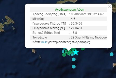 Σεισμική δόνηση μεγέθους 4,6 βαθμών της κλίμακας Ρίχτερ σημειώθηκε σε απόσταση 27 χλμ. ΔΝΔ της Τήλου.