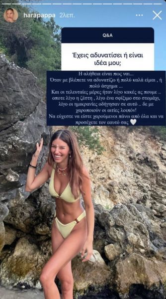 «Η αλήθεια είναι πως ναι. Όταν με βλέπετε να αδυνατίζω ή πολύ καλά είμαι ή πολύ άσχημα… Και οι τελευταίες ημέρες ήταν λίγο κακές ας πούμε… οπότε λίγο η ζέστη, λίγο ένα σφίξιμο στο στομάχι, λίγο οι ημικρανίες οδήγησαν σε αυτό… δε με χαροποιούν οι αιτίες λοιπόν! Να εύχεστε να είστε χαρούμενοι πάνω απ΄ όλα και να προσέχετε τον εαυτό σας», εξομολογήθηκε η Χαρά Παππά.
