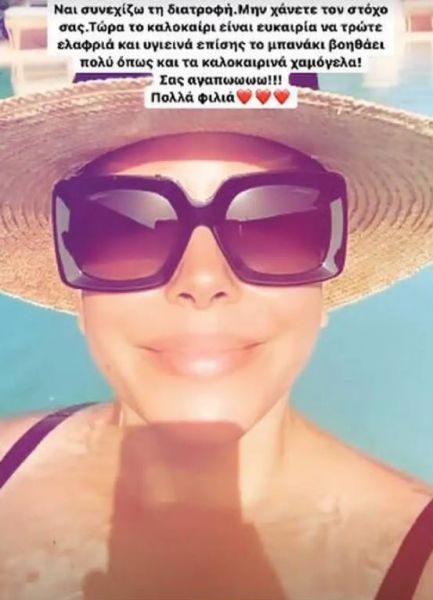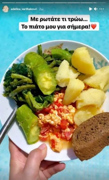 «Ναι, συνεχίζω τη διατροφή μου. Μην χάνετε το στόχο σας. Το καλοκαίρι είναι ευκαιρία να τρώτε ελαφριά και υγιεινά, επίσης το μπανάκι βοηθάει πολύ, όπως και τα καλοκαιρινά χαμόγελα», έγραψε η ίδια στα Insta stories. Μάλιστα,επέλεξε να φάει για μεσημεριανό, ένα νόστιμο και ελαφρύ φαγητό. Βραστά κολοκυθάκια, βραστές πατάτες, ένα παξιμάδι ολικής αλέσεως και λίγη ομελέτα σε στιλ «καγιανά».