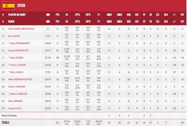 Στο πρώτο ημίχρονο η ομάδα του Γκρεγκ Πόποβιτς έμοιαζε υπνωτισμένη και μουδιασμένη, χάνωντας πολλά σουτ από την περιφέρεια, την ίδια στιγμή που οι Ισπανοί κυριαρχούσαν στα ριμπάουντ.