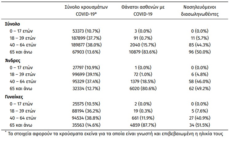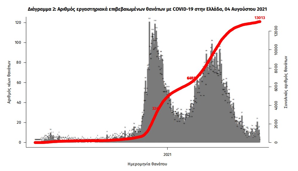 Οι νέοι θάνατοι ασθενών με COVID-19 είναι 16, ενώ από την έναρξη της επιδημίας έχουν καταγραφεί συνολικά 13.013 θάνατοι. Το 95.2% είχε υποκείμενο νόσημα ή/και ηλικία 70 ετών και άνω.