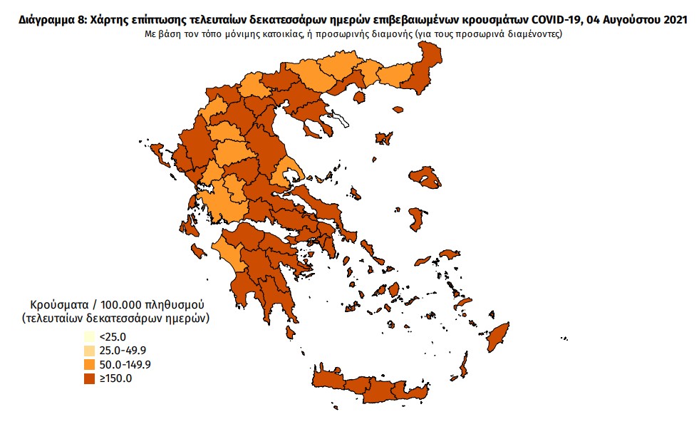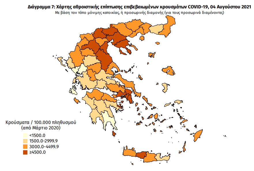 Ο χάρτης αποτυπώνει τη γεωγραφική κατανομή των συνολικών κρουσμάτων COVID-19 (από την αρχή της επιδημίας) ανά Περιφερειακή Ενότητα της χώρας, με βάση την δηλωθείσα διεύθυνση μόνιμης κατοικίας του ασθενούς, ή τη διεύθυνση προσωρινής διαμονής για τους τουρίστες και άλλους προσωρινά διαμένοντες στην Ελλάδα. Συμπεριλαμβάνονται τόσο κρούσματα με ιστορικό ταξιδίου (“εισαγόμενα”) όσο και κρούσματα με πιθανή εγχώρια μετάδοση.
