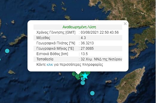Ασθενής σεισμική δόνηση 4,3 βαθμών της κλίμακας Ρίχτερ σημειώθηκε πριν λίγη ώρα στον υποθαλάσσιο χώρο ανοιχτά της Νισύρου.