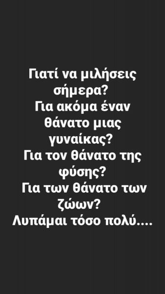 «Γιατί να μιλήσεις σήμερα; Για έναν ακόμα θάνατο μιας γυναίκας; Για τον θάνατο της φύσης; Για τον θάνατο των ζώων; Λυπάμαι τόσο πολύ…»