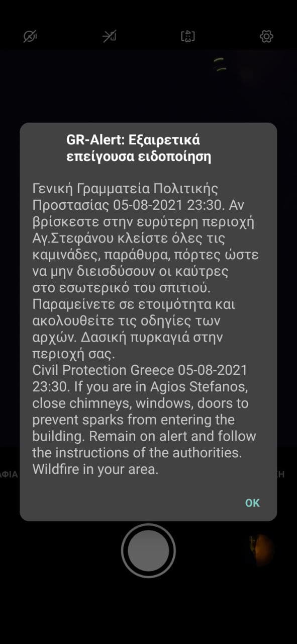 Λίγο μετά τις 11 το βράδυ εστάλη σχετική επείγουσα ειδοποίηση σε όσους βρίσκονται σε Πολυδένδρι, Καπανδρίτι, Ταξιάρχες, Αγ. Γεώργιο ή Πουρίθι να κλείσουν όλες τις καμινάδες, παράθυρα, πόρτες ώστε να μην εισβάλουν οι καύτρες στο εσωτερικό των σπιτιών.