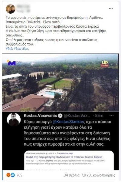 Οι φωτογραφίες συνοδεύονται από τον ισχυρισμό ότι το εν λόγω οίκημα ανήκει στον υπουργό Περιβάλλοντος και Ενέργειας, Κώστα Σκρέκα.