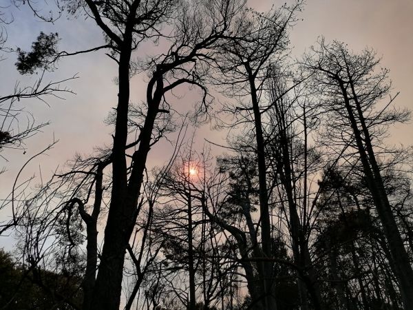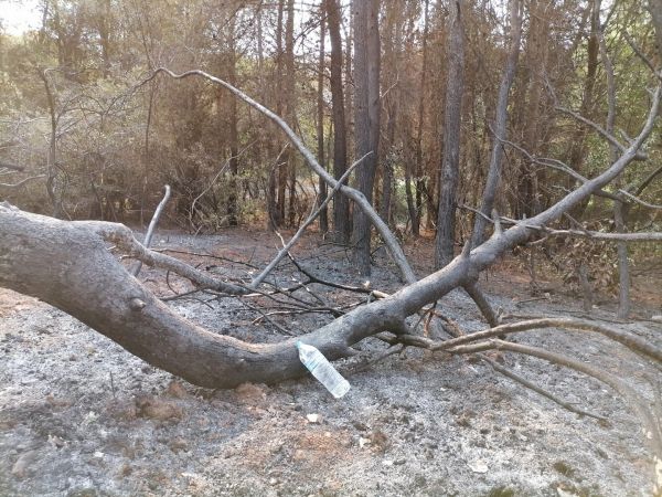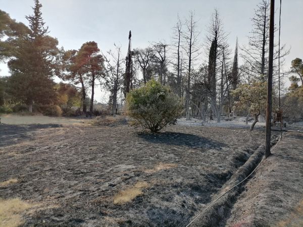 Στα πρώτα μέτρα, τα δέντρα είναι καψαλισμένα και το χώμα μαύρο, όσο προχωράς όμως όλα έχουν γίνει στάχτη. Ένα μικρό οίκημα έχει καταστραφεί ολοσχερώς.