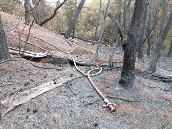 Η μάνικα ακουμπισμένη στο καμένο χώμα, σωλήνες λιωμένοι, κορμοί δέντρων καρβουνιασμένοι αλλά ευτυχώς γύρω γύρω τα σπίτια και τα κτίρια άθικτα.