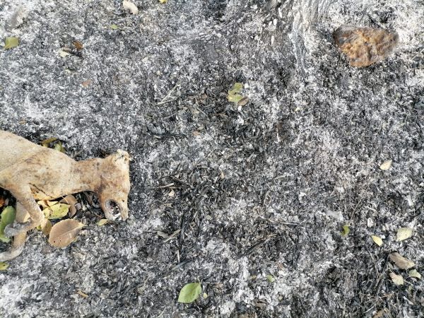 Προχωράω ακόμα πιο μέσα. Συναντώ το καμένο κουφάρι ενός ζώου, μάλλον σκύλου. Είναι ξεκοιλιασμένο.