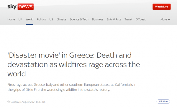 Θέμα στην ιστοσελίδα του βρετανικού δικτύου Sky News έγιναν οι καταστροφικές φωτιές που έπληξαν και συνεχίζουν να πλήττουν τη χώρα μας, κυρίως στην Εύβοια.