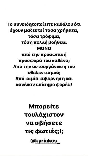 “Το συνειδητοποιείτε καθόλου ότι έχουν μαζευτεί τόσα χρήματα, τόσα τρόφιμα,τόση πολλή βοήθεια μόνο από την προσωπική προσφορά του καθένα; Από την αυτοοργάνωση του εθελοντισμού; Από καμία κυβέρνηση και κανέναν επίσημο φορέα. Μπορείτε τουλάχιστον να σβήσετε τις φωτιές;”, ήταν τα λόγια της Μαίρης Συνατσάκη.