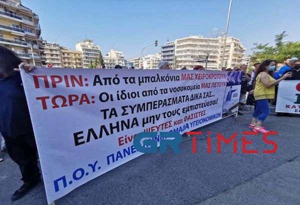 Συγκέντρωση διαμαρτυρίας έξω από το υφυπουργείο Μακεδονίας -Θράκης, πραγματοποίησαν, εργαζόμενοι στα νοσοκομεία της Θεσσαλονίκης αντιδρώντας στην υποχρεωτικότητα του εμβολιασμού, κι ενώ απομένουν λίγες μέρες τεθεί σε εφαρμογή η απόφαση της κυβέρνησης για αναστολή εργασίας όσων υγειονομικών δεν εμβολιαστούν εως την 1η Σεπτεμβρίου.