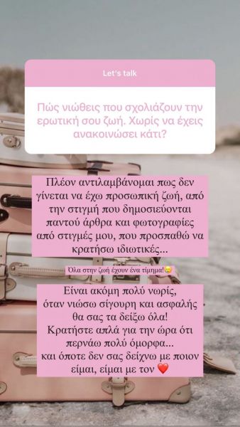 Στη συνέχεια πρόσθεσε: «Είναι ακόμα πολύ νωρίς για να νιώσω σίγουρη και ασφαλής και θα σας τα δείξω όλα. Κρατήστε απλά για την ώρα ότι περνάω πολύ όμορφα και όποτε δεν σας δείχνω με ποιον είμαι, είμαι με τον….».