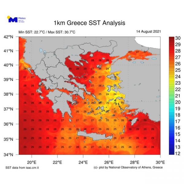 Μετά από ένα παρατεταμένο διάστημα υψηλών θερμοκρασιών και απουσία ισχυρών ανέμων στα πελάγη, η θερμοκρασία της επιφάνειας της θάλασσας φτάνει και τοπικά ξεπερνά τους 30°C.