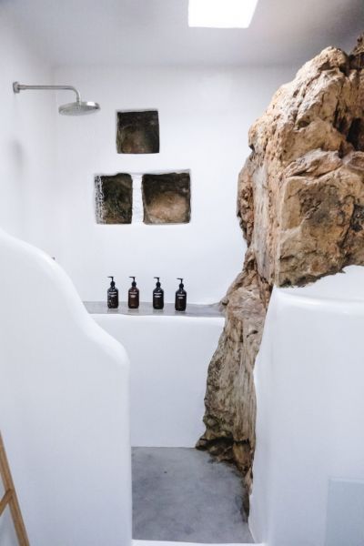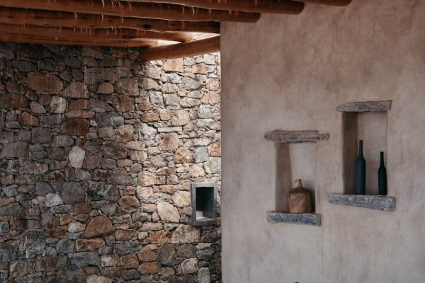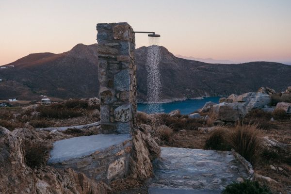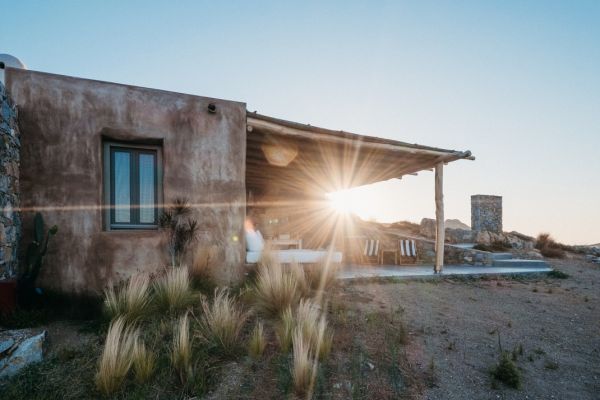 Τα δυο σπίτια είναι χτισμένα σε ένα άγονο άγριο τοπίο στους πρόποδες ενός επιβλητικού γυμνού βουνού. Η απόλυτη ελληνική, νησιώτικη ομορφιά που αγκαλιάζει την άγρια όψη της φύσης και αποκαλύπτει το φως από όλες τις γωνίες.