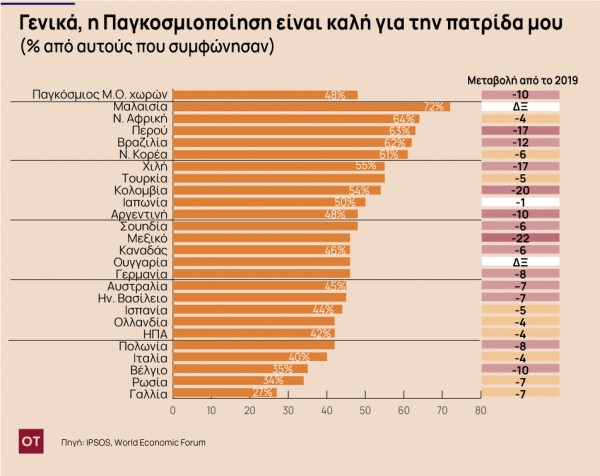 Η Γαλλία, η Ρωσία και το Βέλγιο δείχνουν τη χαμηλότερη εμπιστοσύνη έναντι της παγκοσμιοποίησης, ενώ η Μαλαισία, η Νότια Αφρική, το Περού, η Βραζιλία και η Νότια Κορέα έχουν τη μεγαλύτερη.