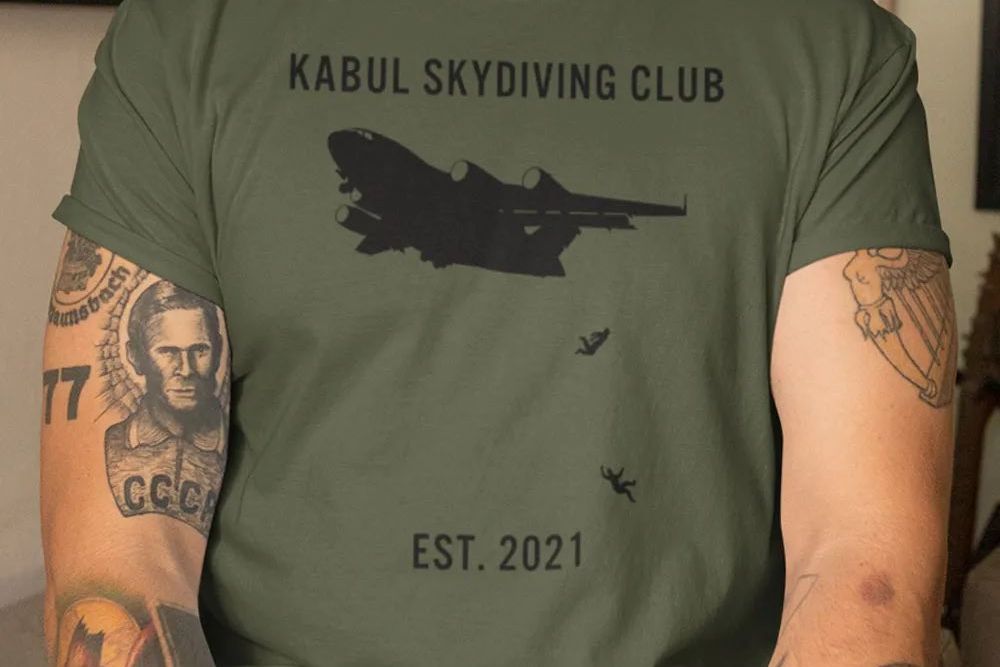 Τα μπλουζάκια, που πωλούνται έναντι 14 ευρώ και τα οποία κυκλοφορούν σε γκρι και μαύρο χρώμα, φέρουν το σύνθημα «Kabul Skydiving Club, Est 2021». Σε αυτά διακρίνεται ένα αεροπλάνο C-17 και άνθρωποι που πέφτουν από αυτό.