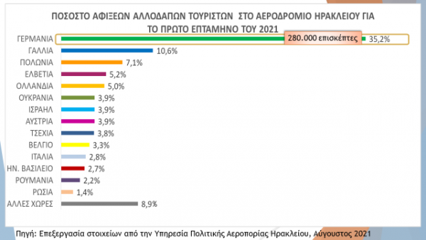Αναφορικά με τις αφίξεις αλλοδαπών τουριστών στο αεροδρόμιο Ηρακλείου και με βάση τα πρόσφατα στοιχεία της Υπηρεσίας Πολιτικής Αεροπορίας Ηρακλείου, για την περίοδο Ιανουάριος-Ιούλιος 2021, σημειώνονται 793 χιλ. αφίξεις, καταγράφοντας μία ενθαρρυντική αύξηση της τάξεως του 250% σε σχέση με την αντίστοιχη περυσινή περίοδο. Ο αριθμός αυτός των συνολικών αφίξεων είναι ικανοποιητικός, δεδομένων των συνθηκών, αν αναλογιστούμε ότι σε όλη την περυσινή χρονιά οι συνολικές αφίξεις αλλοδαπών τουριστών ήταν μόλις 900 χιλιάδες, αριθμός που αποτελεί επίσης ιστορικό χαμηλό τουλάχιστον κατά τα τελευταία 25 έτη.