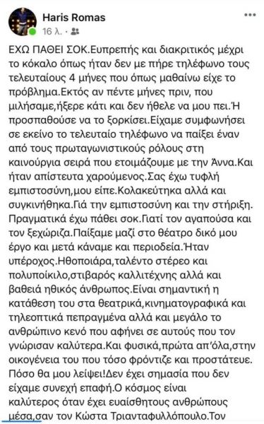 »Πόσο θα μου λείψει! Δεν έχει σημασία που δεν είχαμε συνεχή επαφή. Ο κόσμος είναι καλύτερος όταν έχει ευαίσθητους ανθρώπους μέσα, σαν τον Κώστα Τριανταφυλλόπουλο. Τον Κώστα μας, που αποχαιρετώ σήμερα με ένα δάκρυ αληθινό», κατέληξε ο Χάρης Ρώμας.