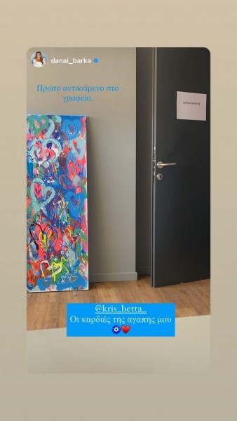 Αυτό, προέρχεται από την καλή της φίλη, Χριστιάνα Μπέτα. Είναι η μεγάλη κόρη της Νατάσας Θεοδωρίδου. Η νεαρή ασχολείται με τη ζωγραφική και έστειλε στην Δανάη Μπάρκα έναν πίνακα που ζωγράφισε η ίδια. Είναι πολύχρωμος με καρδιές. «Πρώτο αντικείμενο στο γραφείο», έγραψε χαρακτηριστικά στο story της η Δανάη Μπάρκα.