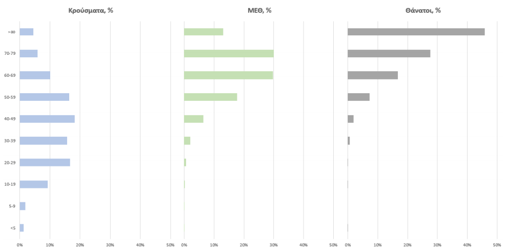 Ο αριθμός των ασθενών που νοσηλεύονται διασωληνωμένοι είναι 326 (58.3% άνδρες). Η διάμεση ηλικία τους είναι 65 έτη. To 83.1% έχει υποκείμενο νόσημα ή/και ηλικία 70 ετών και άνω. Από την αρχή της πανδημίας έχουν εξέλθει από τις ΜΕΘ 2.926 ασθενείς. Οι εισαγωγές νέων ασθενών Covid-19 στα νοσοκομεία της επικράτειας είναι 293 (ημερήσια μεταβολή +9.74%). Ο μέσος όρος εισαγωγών του επταημέρου είναι 272 ασθενείς.